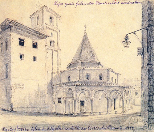 La chiesa del Santo Sepolcro è attestata per la prima volta come annessa all’Ospedale dei Fratelli Ospitalieri nel 1138, da un documento conservato presso l’Archivio di Stato di Pisa. Si trattò di una sorta di “opera prima”, in ambito pisano, del grande architetto Diotisalvi, largamente conosciuto come ideatore e costruttore del più tardo (1153) Battistero di Piazza dei Miracoli.