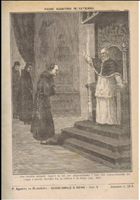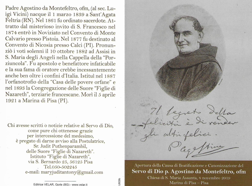 P. Agostino da Montefeltro (al secolo Luigi Vicini) nacque a Sant’Agata Feltria il 1° marzo 1839 da Giovanni Battista Vicini e da Orsola Mariani. Entrato a 18 anni nel seminario di Pennabilli, fu ordinato sacerdote il 21 dicembre 1861, alla giovanissima età di 22 anni ed inviato nella parrocchia del suo paese natale. Nel 1864 accettò il posto d’insegnante alle Balze, località montuosa poco distante da Sant’Agata, ma in un’altra diocesi, cosa che dispiacque non poco al vescovo Mariotti, il quale temeva di perdere per sempre il giovane e promettente sacerdote. Il soggiorno alle Balze si protrasse per due anni, fino al 1866, dopo di che fece ritorno a Sant’Agata come cappellano nella collegiata.