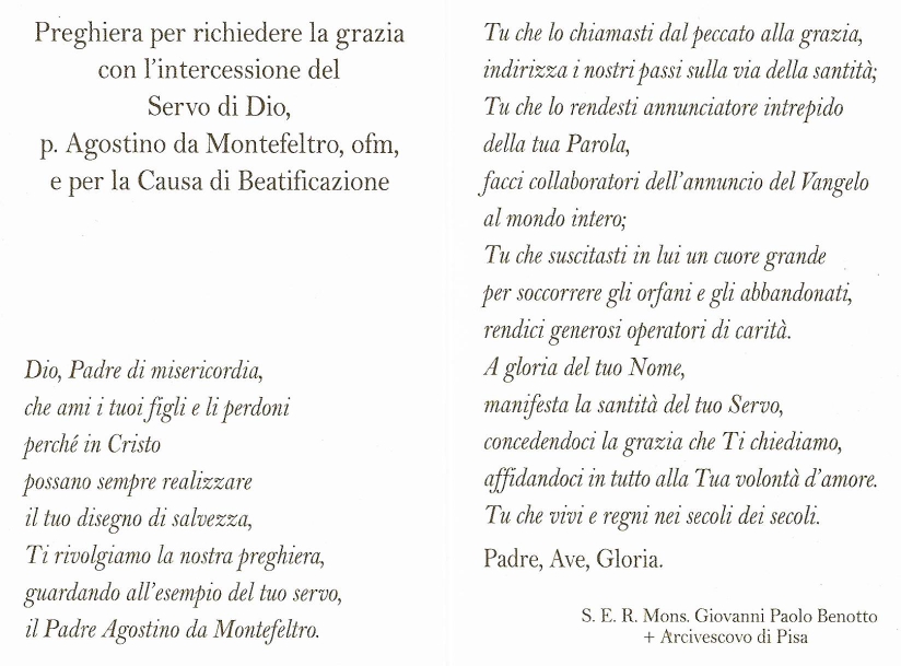 La sua salma fu sepolta nella chiesa di S. Maria Assunta a Marina di Pisa. L’8 novembre 2019 Mons. Giovanni Paolo Benotto, Arcivescovo di Pisa, ha solennemente aperto la Causa di Beatificazione del Servo di Dio, p. Agostino da Montefeltro ofm.